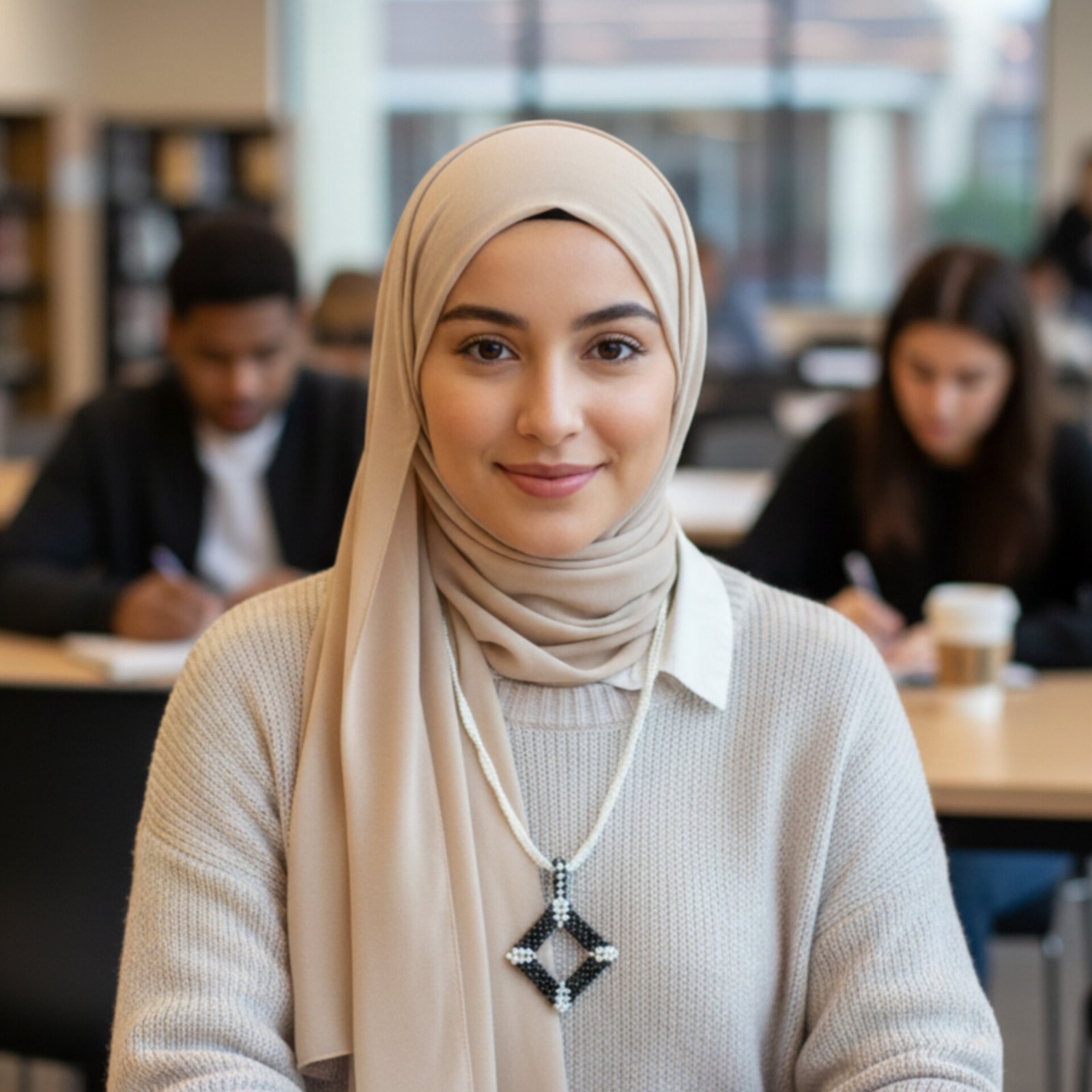 You can style this black and white piece in many ways. For example, wear it over a plain black sweater to show off the white bead accents. Or, pair it with a white hijab to highlight the dark frame of the pendant. Because it has a clean, geometric style, it works well for both office meetings and casual lunches. The simple colors also match any other silver or gold rings you choose to wear.