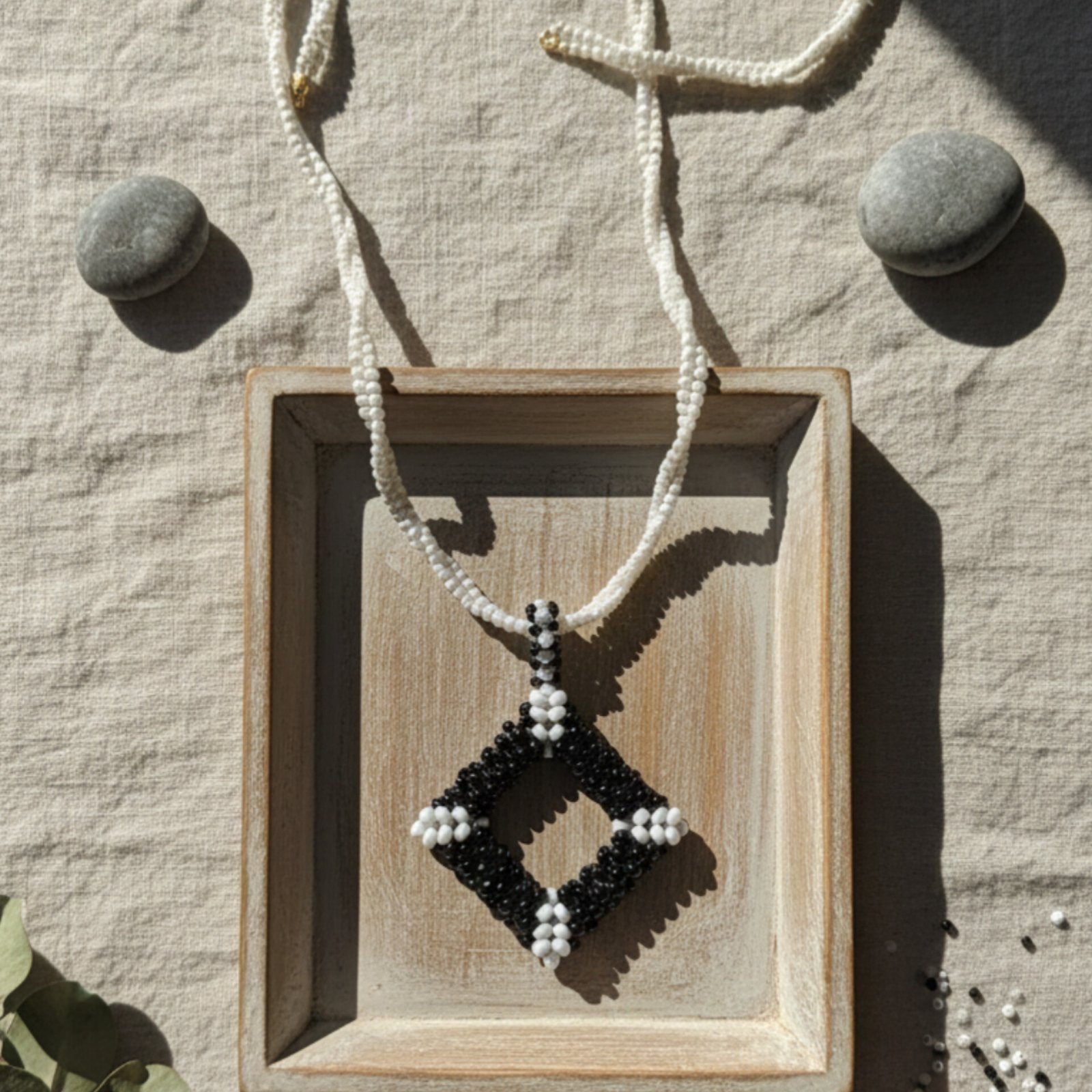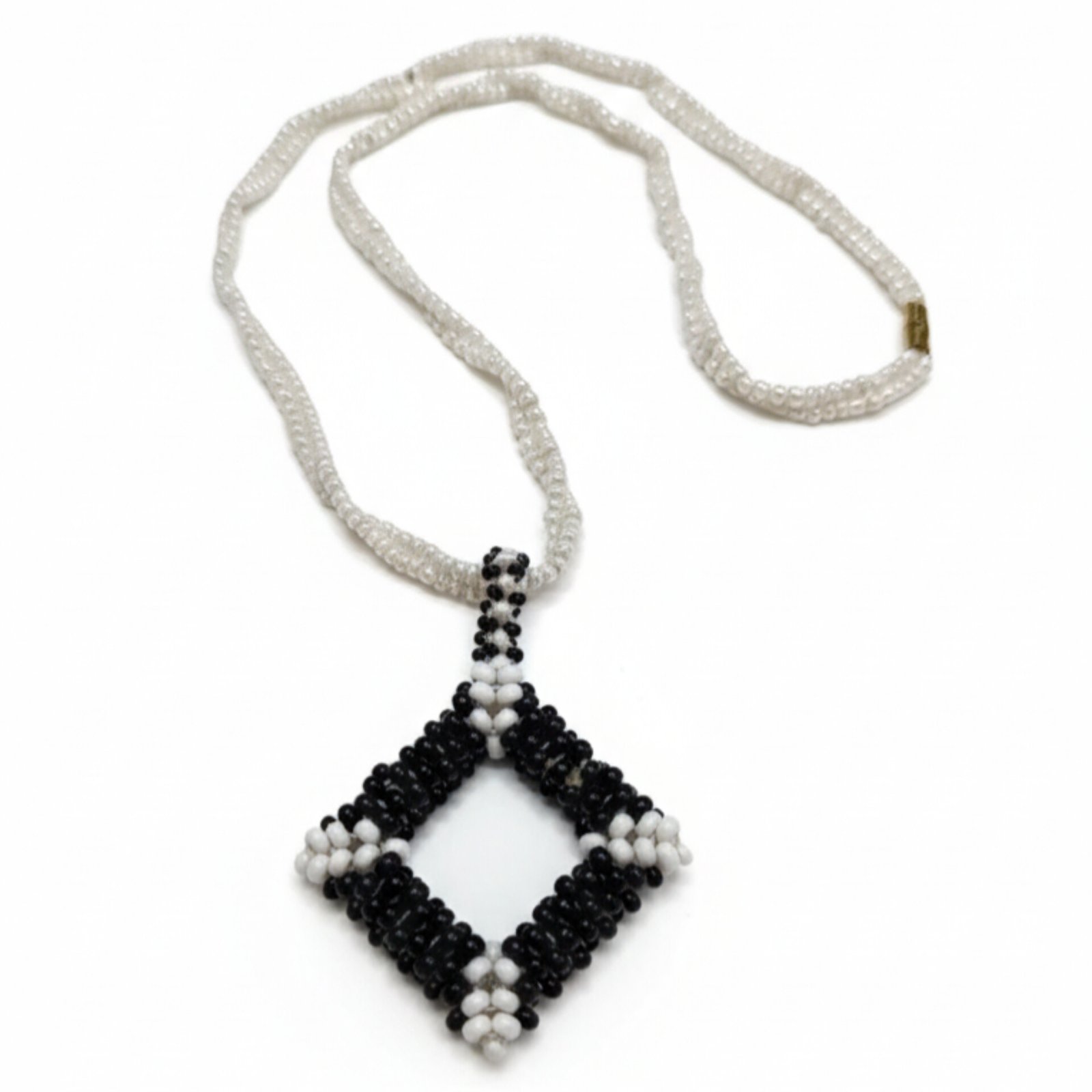 The Midnight Frame Beaded Necklace features a handwoven diamond pendant in bold black and white. This striking piece hangs on a long, delicate white bead chain for a clean and modern look. Because it uses a secure barrel clasp, it is easy to put on and take off. This artisan necklace is a perfect choice for those who want a classic accessory with a unique twist.
